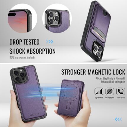 For iPhone 13 JEEHOOD J10 Flip Card Bag MagSafe Split RFID Leather Phone Case(Purple)