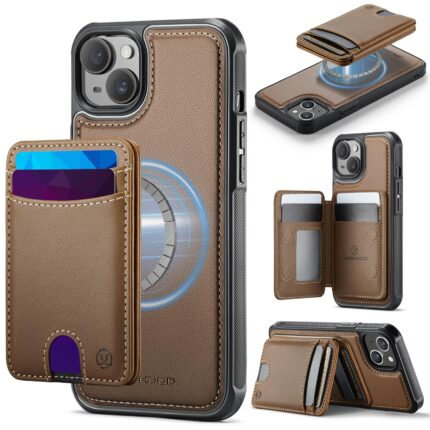 For iPhone 13 JEEHOOD J10 Flip Card Bag MagSafe Split RFID Leather Phone Case(Brown)