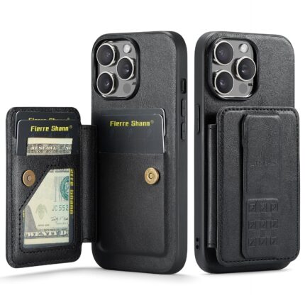 For iPhone 14 Pro Fierre Shann Oil Wax Cow Leather Card Holder Back Phone Case(Black)