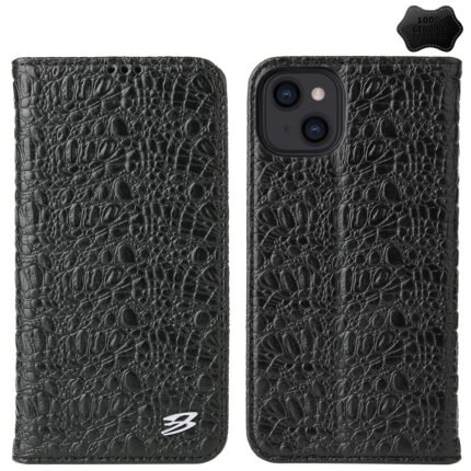 For iPhone 15 Plus Fierre Shann Crocodile Texture Magnetic Genuine Leather Phone Case(Black)