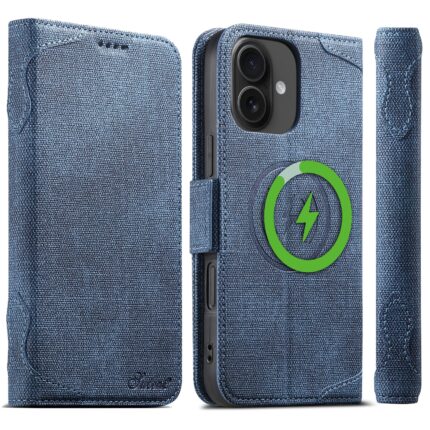 For iPhone 16 Suteni J07 Multi-functional Horizontal MagSafe Denim Leather Phone Case(Blue)