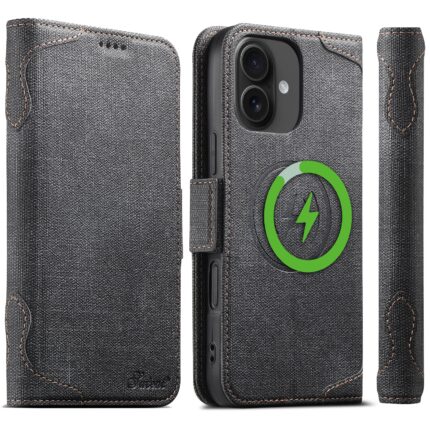 For iPhone 16 Plus Suteni J07 Multi-functional Horizontal MagSafe Denim Leather Phone Case(Black)