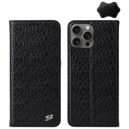 For iPhone 16 Pro Fierre Shann Crocodile Texture Magnetic Genuine Leather Phone Case(Black)