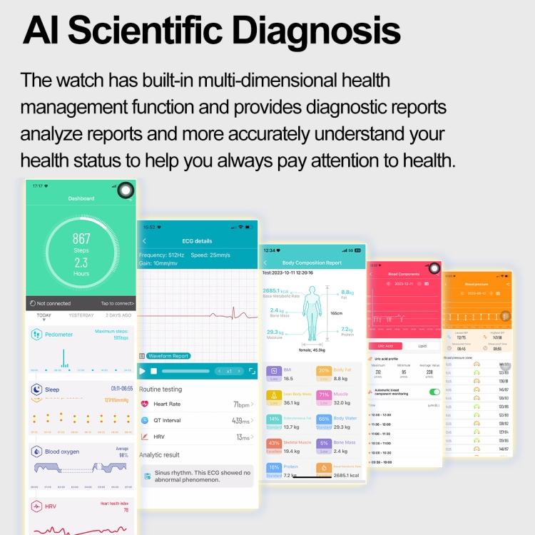 2. Bluetooth communication, non-invasive blood glucose measurement, blood composition measurement (uric acid and lipid function), body composition BMI and body fat measurement