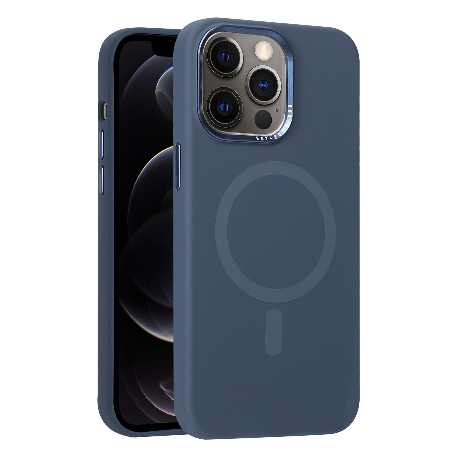 For iPhone 12 Pro Metal Lens Frame Liquid Silicone MagSafe Phone Case(Midnight Blue)