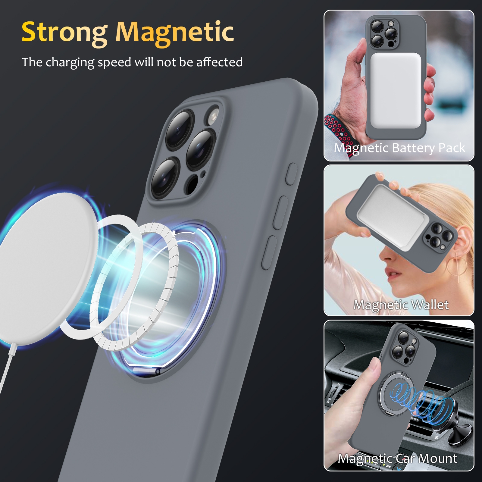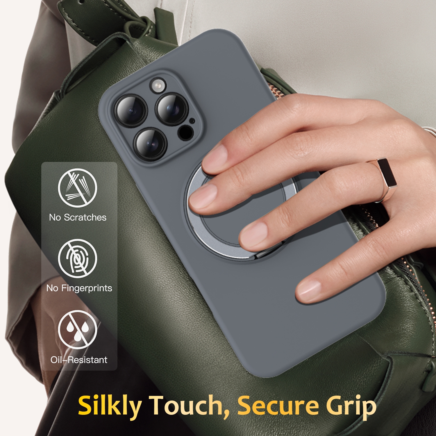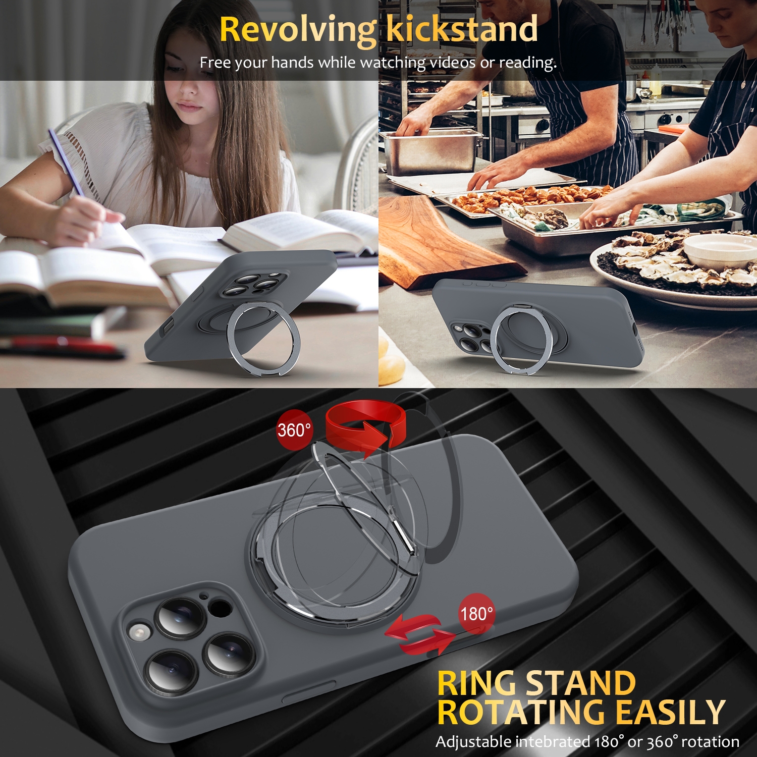 For iPhone 13 Pro Liquid Silicone MagSafe Phone Case with Rotating Holder(Grey)