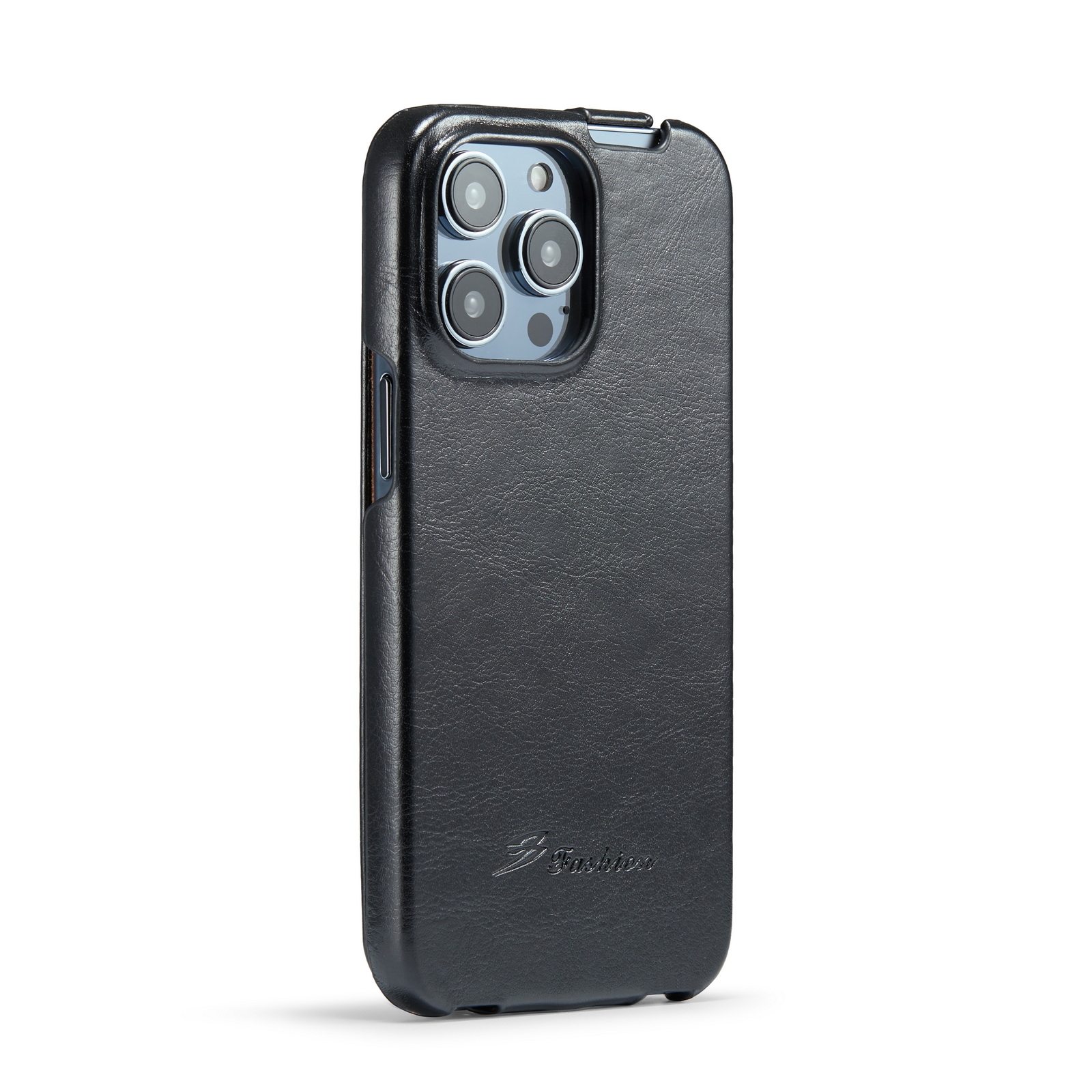 For iPhone 14 Pro Max Fierre Shann Oil Wax Texture Vertical Flip PU Phone Case (Black)