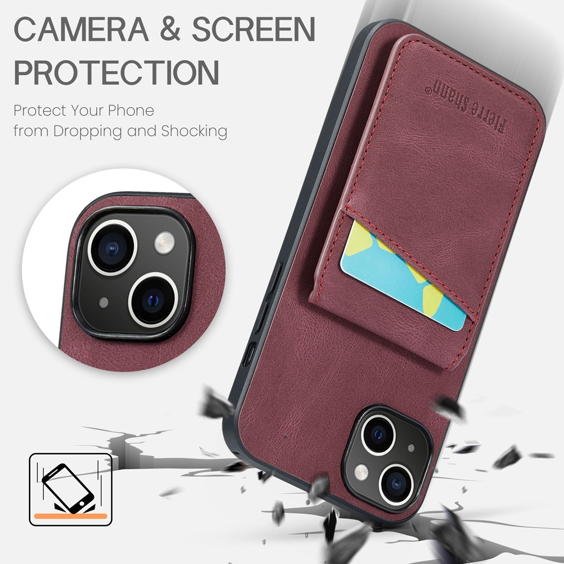 For iPhone 15 Fierre Shann Crazy Horse Card Holder Back Cover PU Phone Case(Wine Red)