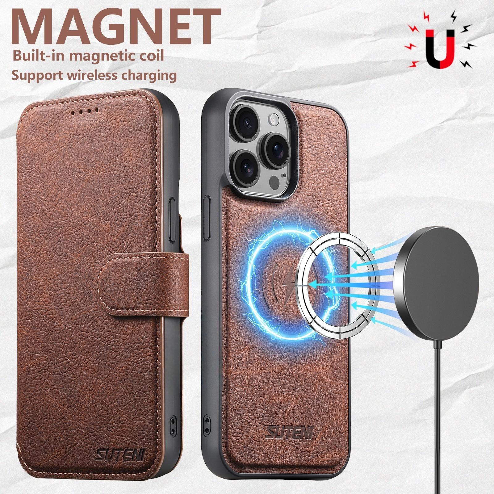 For iPhone 15 Plus Suteni Q05 2-in-1 Multi-function MagSafe Wallet Litchi Leather Phone Case(Brown)