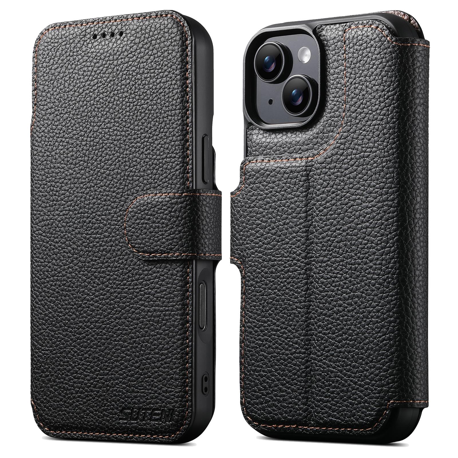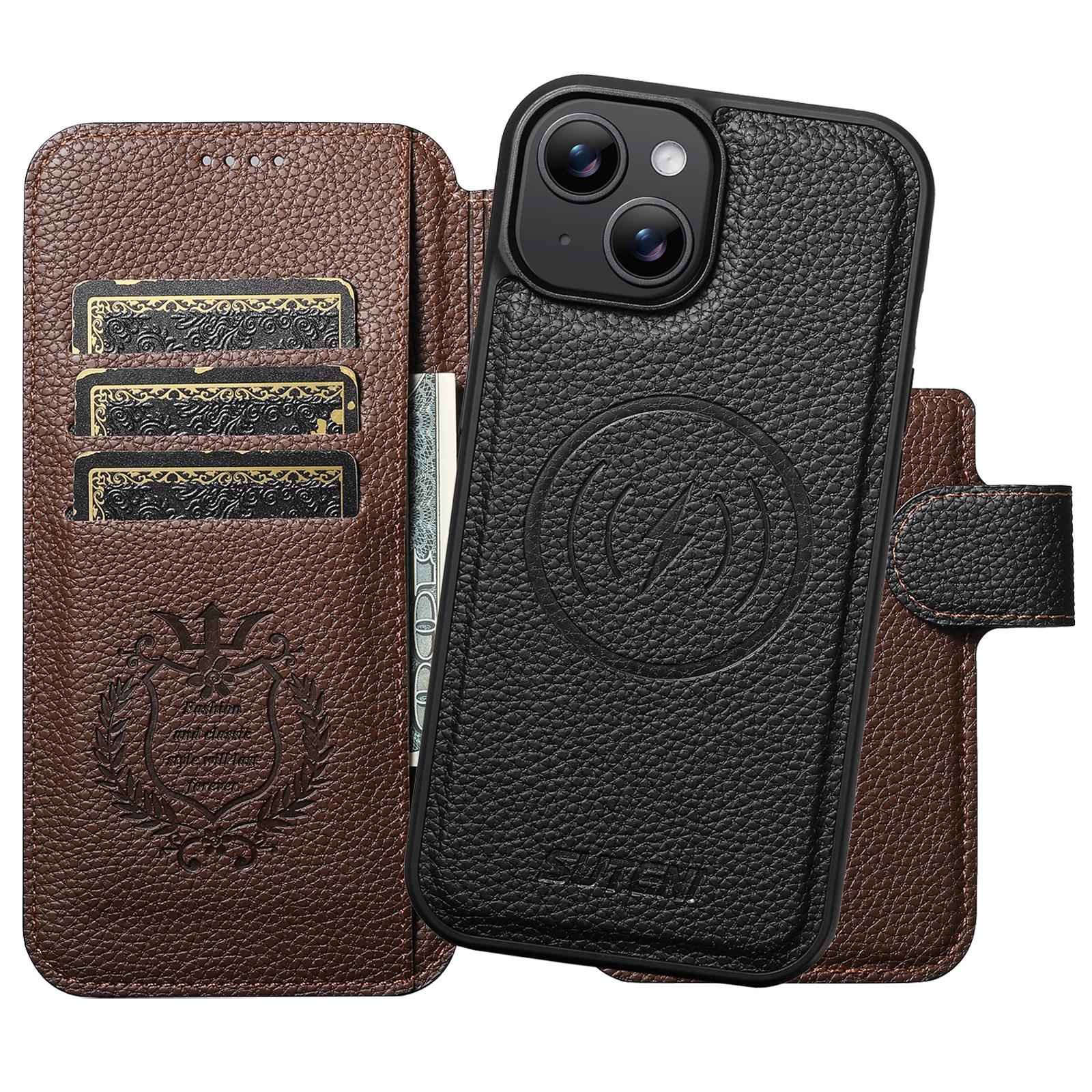 For iPhone 15 Plus Suteni Q05 -in-1 Multi-function MagSafe Wallet Big Litchi Leather Phone Case(Black)