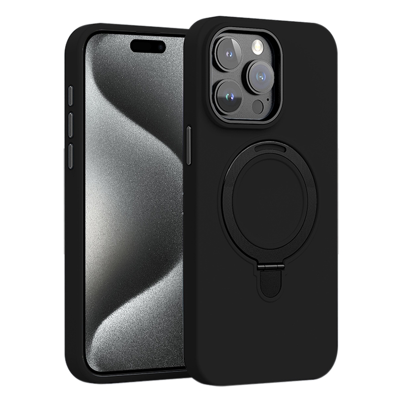 For iPhone 15 Pro Max Liquid Silicone MagSafe Metal Ring Holder Phone Case(Black)