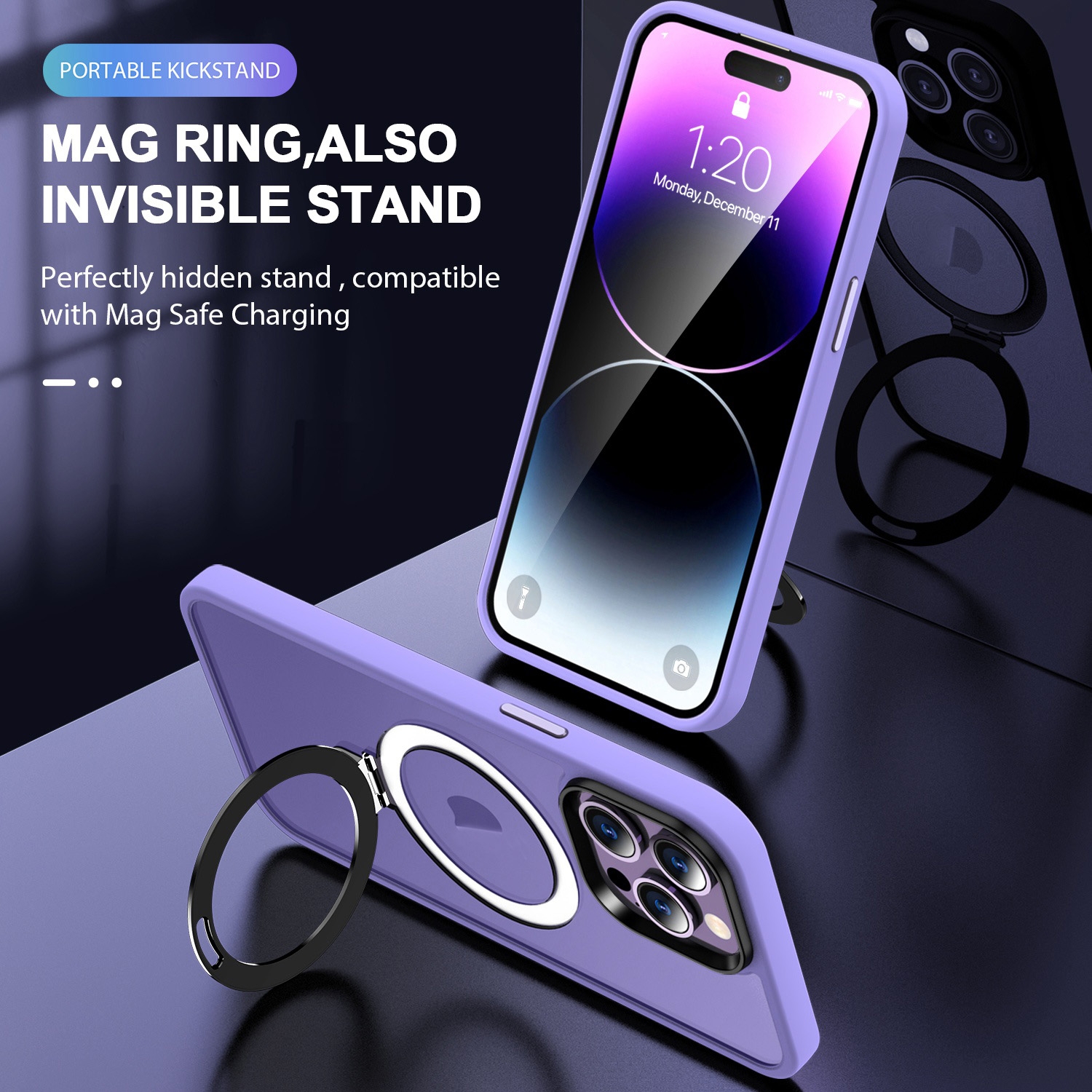 6. 360 Rotate Ring Stand: With a compact and practical design, we seamlessly combine powerful MagSafe tech with a foldable stand. The built-in kickstand effortlessly rotates 360 degrees and folds 120 degrees, giving you the ideal viewing angle for both landscape and portrait orientations. When folded, it seamlessly aligns with the back of the case, maintaining a slim profile for easy pocket-sliding.