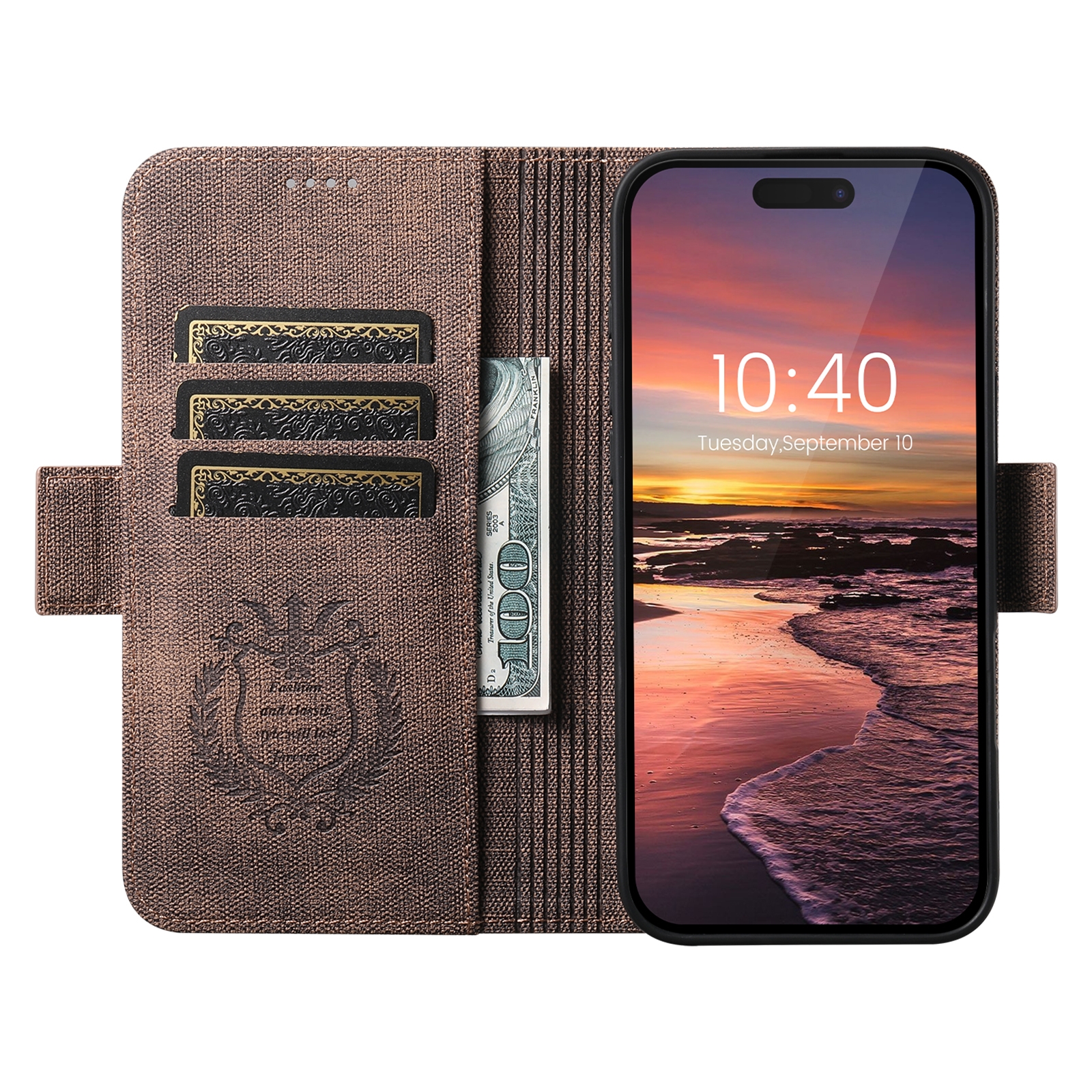 For iPhone 16 Plus Suteni J07 Multi-functional Horizontal MagSafe Denim Leather Phone Case(Brown)