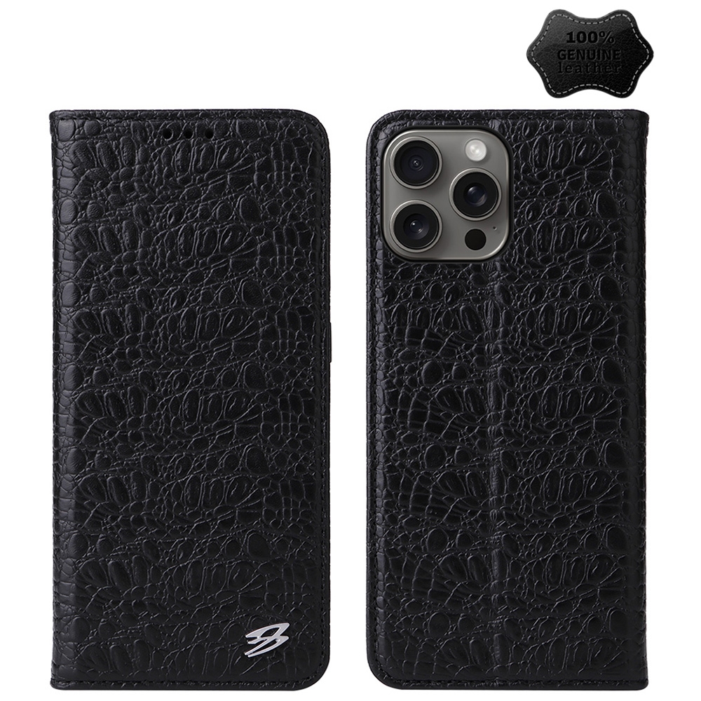For iPhone 16 Pro Max Fierre Shann Crocodile Texture Magnetic Genuine Leather Phone Case(Black)