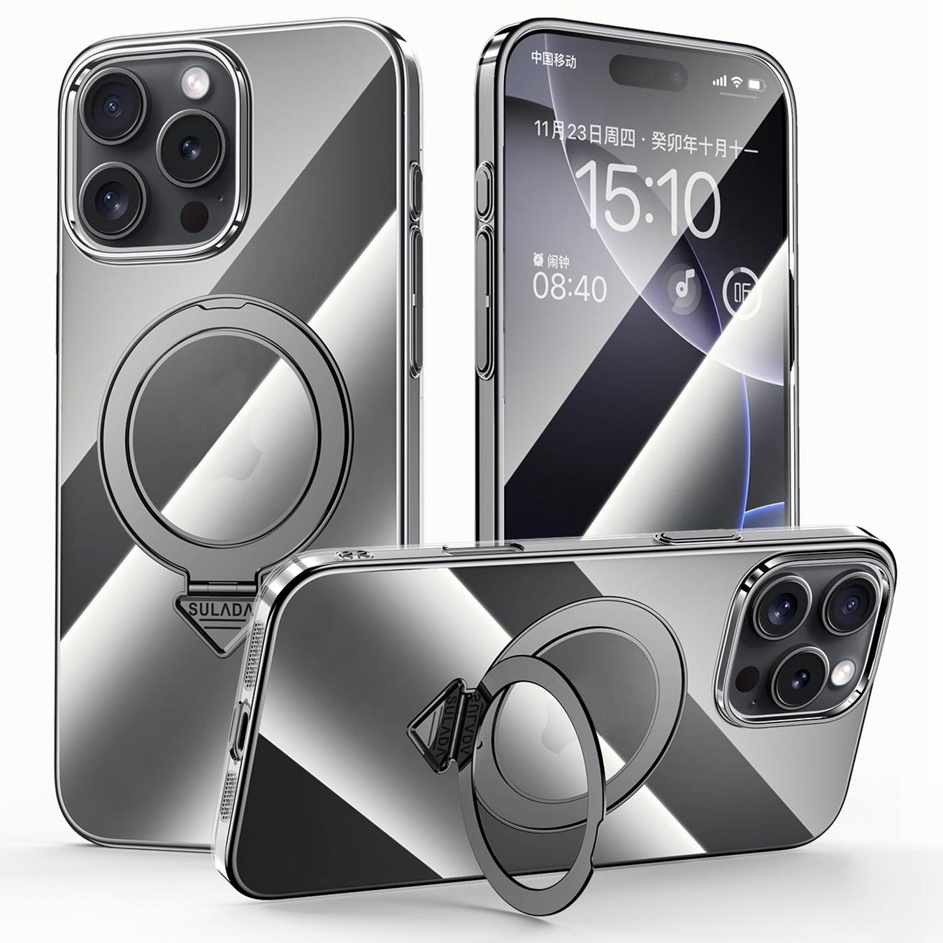 For iPhone 16 Pro Max SULADA Electroplated Transparent MagSafe Holder Phone Case(Black)