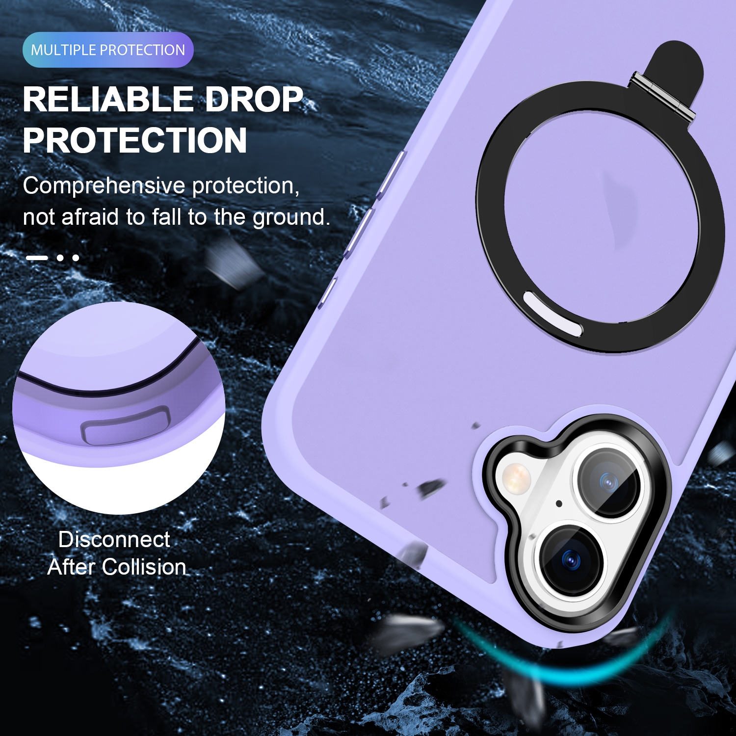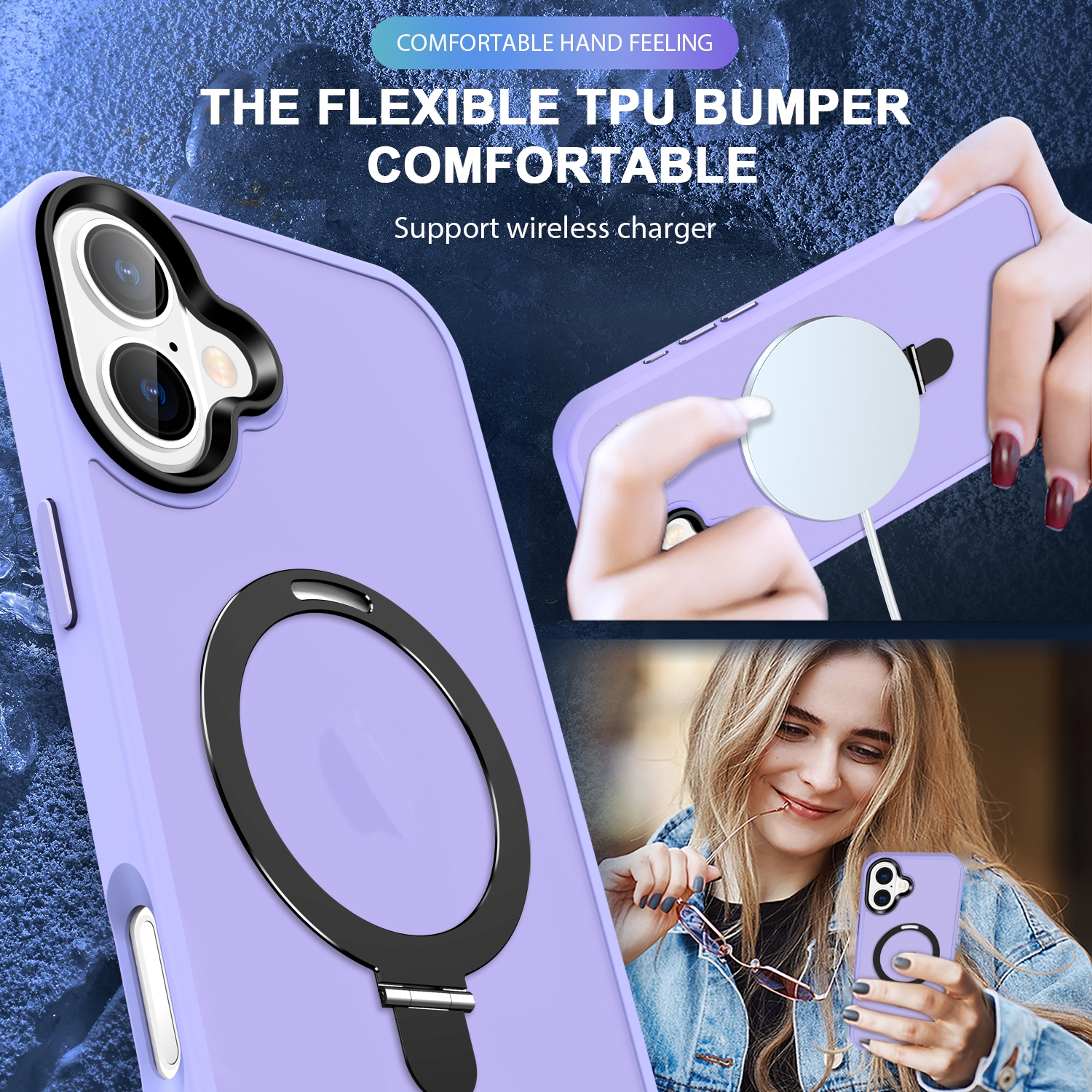 6. 360 Rotate Ring Stand: With a compact and practical design, we seamlessly combine powerful MagSafe tech with a foldable stand. The built-in kickstand effortlessly rotates 360 degrees and folds 120 degrees, giving you the ideal viewing angle for both landscape and portrait orientations. When folded, it seamlessly aligns with the back of the case, maintaining a slim profile for easy pocket-sliding.