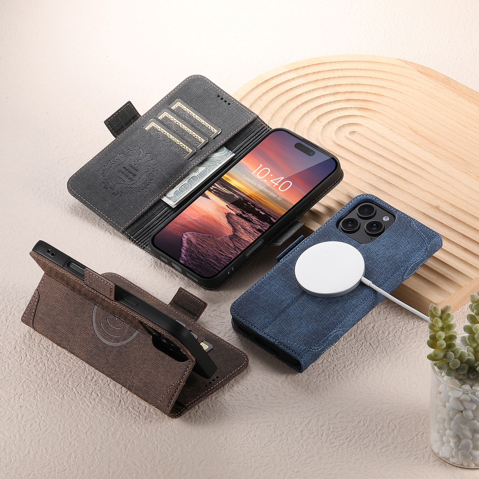 For iPhone 16 Suteni J07 Multi-functional Horizontal MagSafe Denim Leather Phone Case(Black)